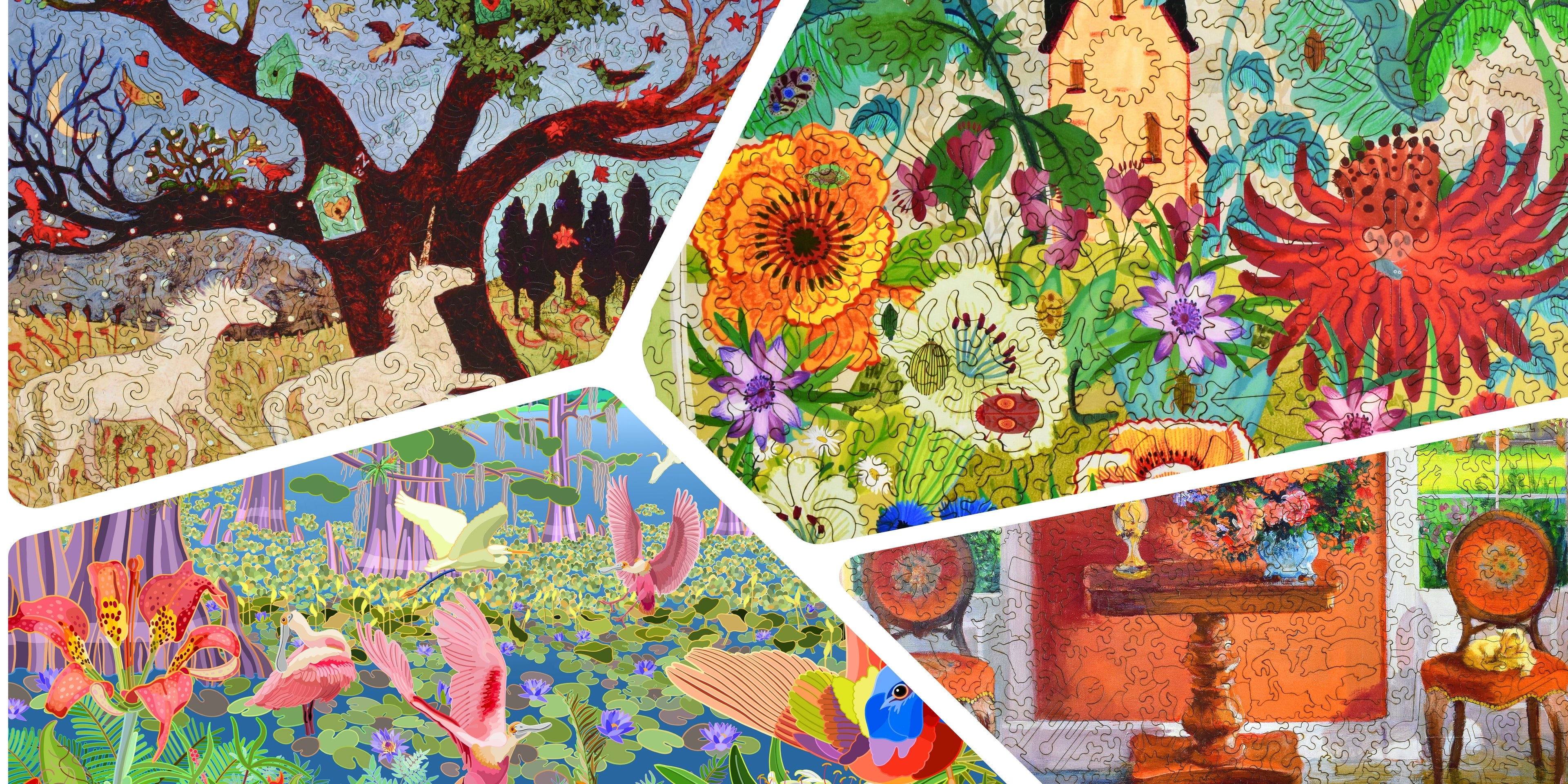 Every Liberty Puzzle contains our signature “whimsy” pieces, hand-drawn in the shape of figurals, animals, plants, geometric shapes, and other unique designs that complement the image of the puzzle. Guaranteed to charm and delight as you find and fit each one.